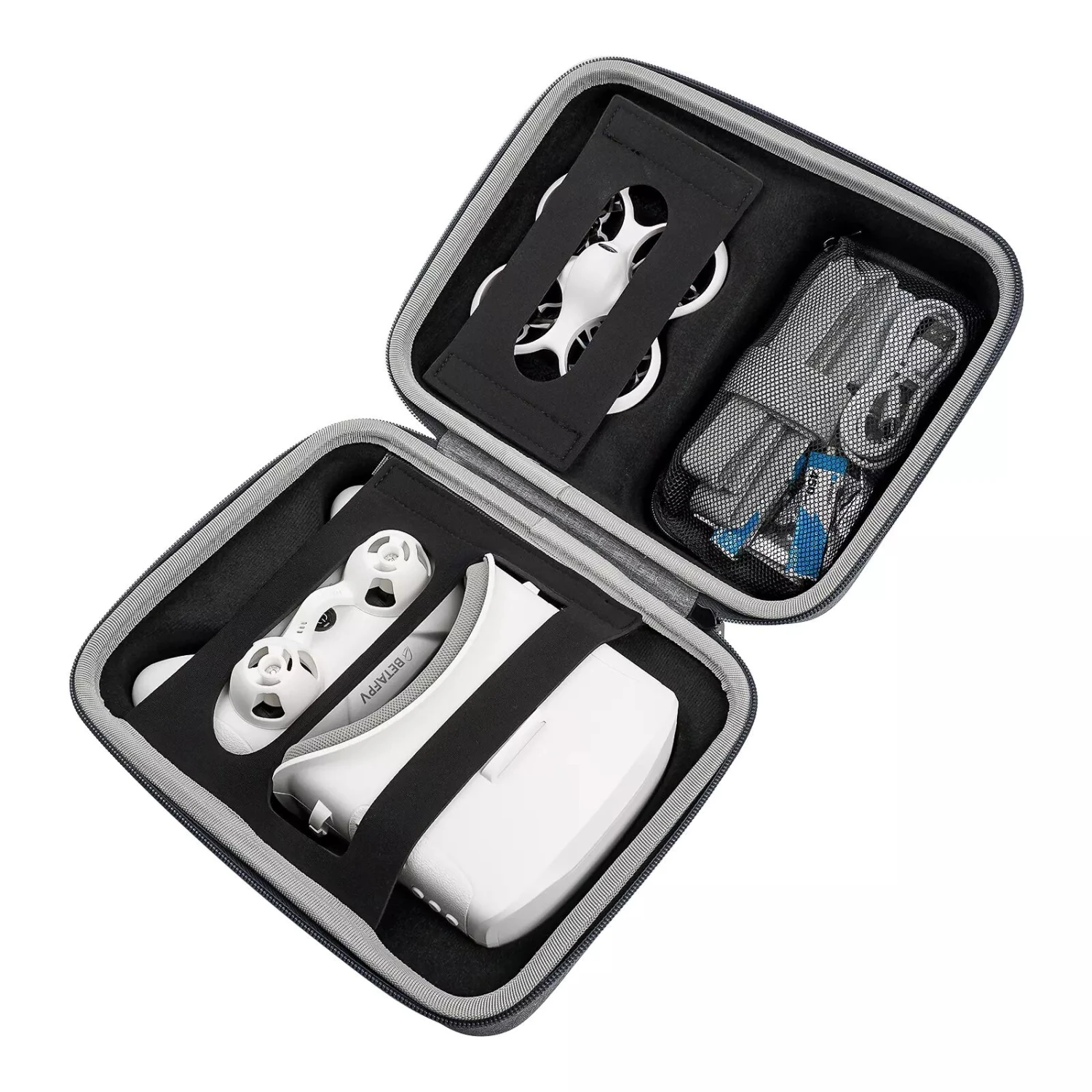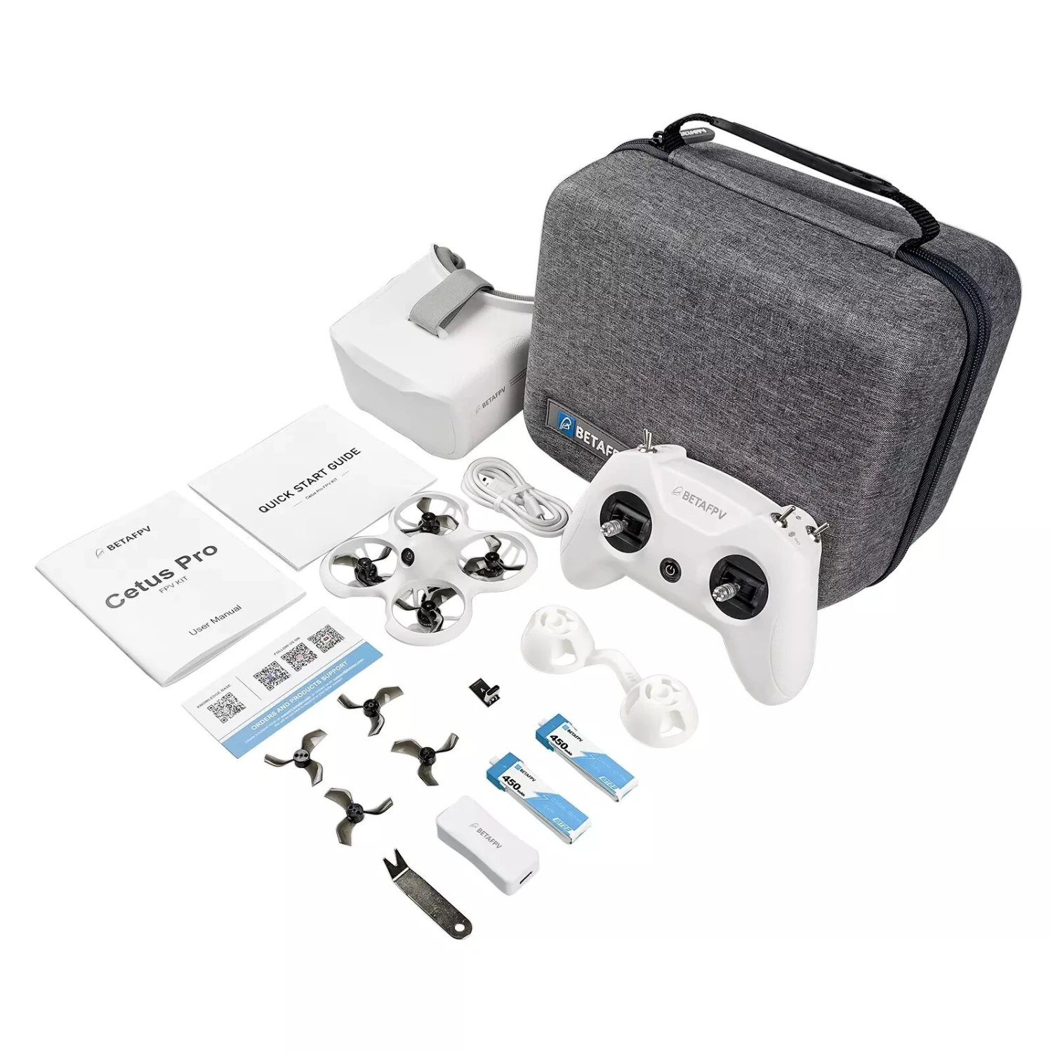 Il est fourni avec tout le nĂ©cessaire pour voler dès la sortie de boĂ®te : radiocommande, casque FPV, jeu d’hĂ©lices et deux batteries !